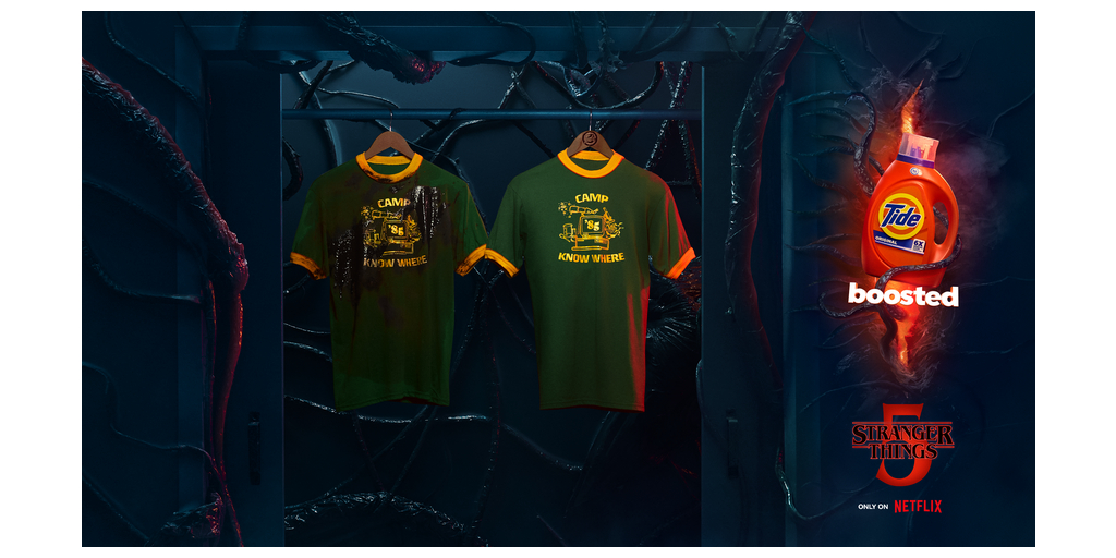 CINCINNATI--(BUSINESS WIRE)--Tide®, America’s #1 trusted laundry detergent brand, is proud to announce its partnership with Netflix’s Stranger Things for the show’s highly anticipated fifth and final season. This collaboration celebrates the show’s most memorable looks - like Eleven’s pink dress and Dustin’s ‘Camp Know Where’ tee - with stain-induced scenes inspired by the show, like Demogorgon-goo and pizza grease, putting Tide’s most advanced formula yet to the test. The partnership is brought to life through a nostalgic TV commercial starring Stranger Things actress Cara Buono.